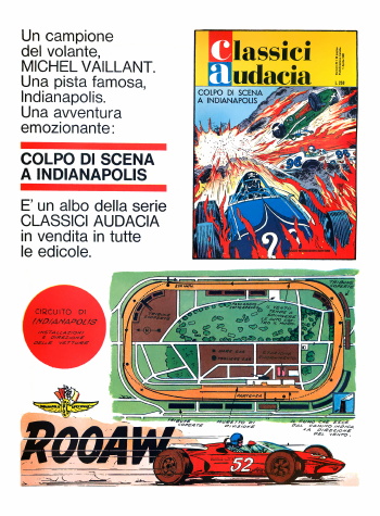 Questa pubblicità è apparsa su varie riviste Mondadori nel 1964 per pubblicizzare l'uscita del 13° volume della collana dei Classici dell'Audacia con il sesto episodio di Michel Vaillant.