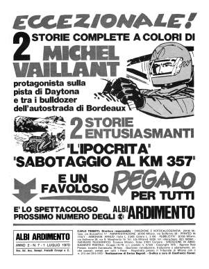 Chi si abbonava a La Domenica del Corriere poteva avere in regalo, tra le varie scelte, gli Albi Ardimento o l'albo speciale "I nuovi eroi" che conteneva, tra le altre, anche un paio di storie brevi con Michel Vaillant. Questa pubblicità è stata pubblicata nel n° 1 del 1970.