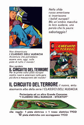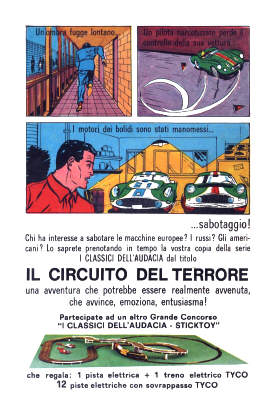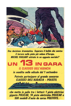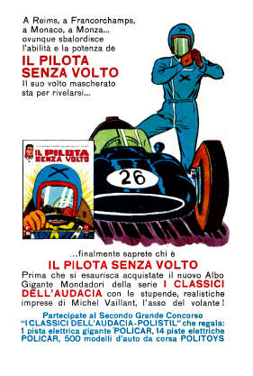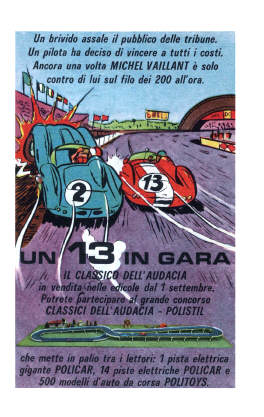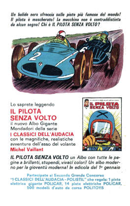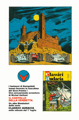 Questa pubblicità è apparsa su varie riviste Mondadori nel 1964 per pubblicizzare l'uscita del 13° volume della collana dei Classici dell'Audacia con il sesto episodio di Michel Vaillant.