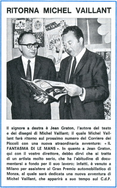 Nel 1968 Jean Graton si è recato a Monza per documentarsi prima della creazione del 18° episodio della serie normale ("De l'huile sur la piste" - "Brivido a Monza"). Durante la trasferta italiana è passato anche nella sede del Corriere dei Piccoli, a Milano, settimanale nel quale erano approdate le storie di Michel Vaillant. In questa foto, pubblicata proprio sul Corriere dei Piccoli n° 40 del 6 ottobre 1968 vediamo il maestro nella redazione del giornale sfogliare il "Corrierino" n°14/68 assieme al direttore Carlo Triberti (proprio davanti al poster di Michel, allegato al n° 31/68, che potete vedere qui sopra).